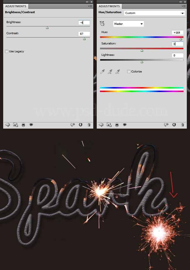 Добавьте еще одно изображение искры. Для того, чтобы подогнать его по цвету, вам потребуется два корректирующих слоя Brightness/Contrast/Яркость/Контраст и Hue/Saturation/Цветовой тон/Насыщенность.