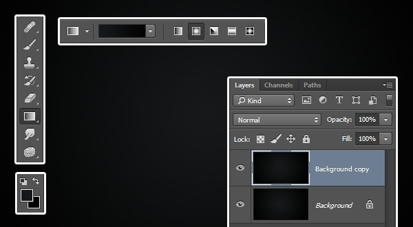 Создайте новый документ размером 1342 x 755 px. Выберите в качестве первого цвета #161819 и в качестве фонового #010101. Возьмите инструмент Gradient/Градиент, выберите радиальный градиент в панели настроек и растяните градиент от центра документа к одному из углов. Дублируйте фоновый слой.