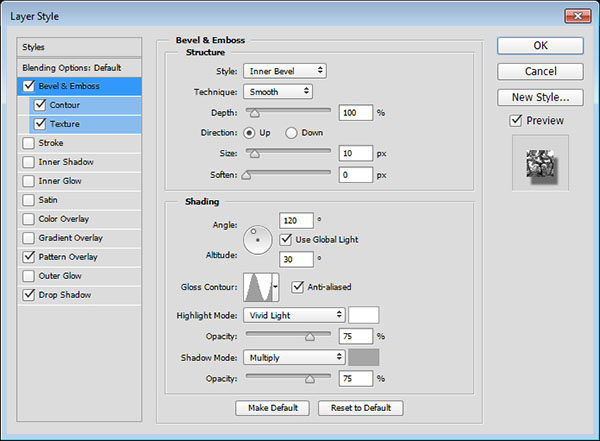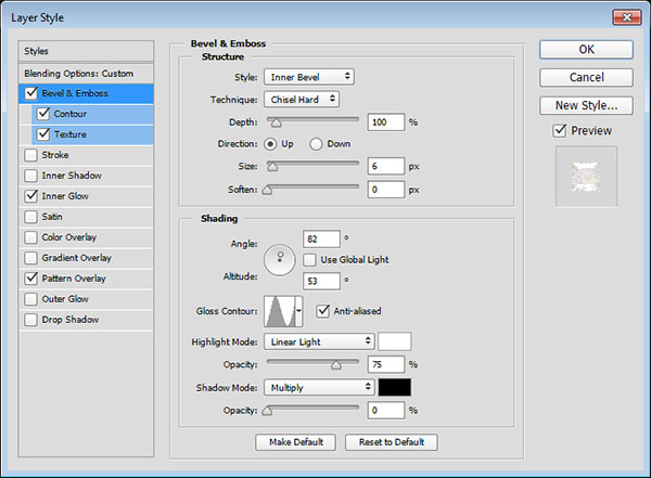 Укажите слою стиль Bevel and Emboss/Тиснение с указанными ниже параметрами: