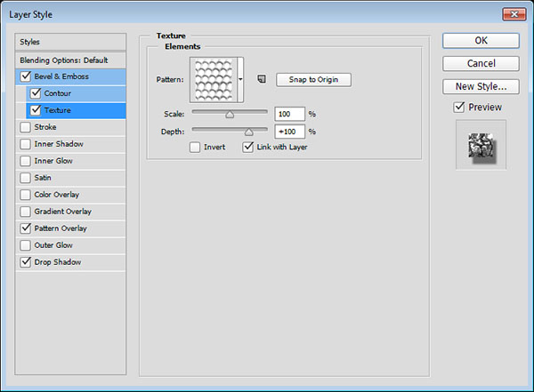 Кликните дважды по копии фонового слоя и укажите ему стиль слоя Pattern Overlay/Перекрытие узора, используя следующие параметры: