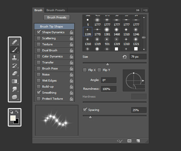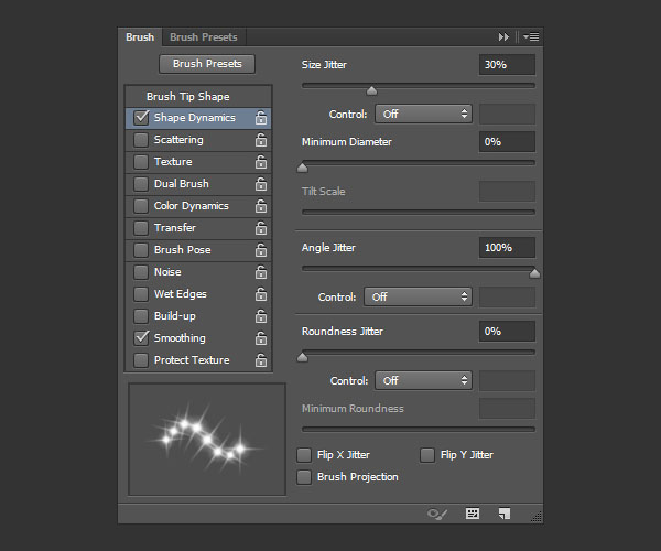 Выберите в качестве первого цвета #f4f1e3, возьмите инструмент Brush/Кисть и откройте палитру Brush/Кисть (Window > Brush/Окно>Кисть). Выберите одну из кистей набора Stars and Flares Brush Set и измените параметры кисти, как указано ниже: