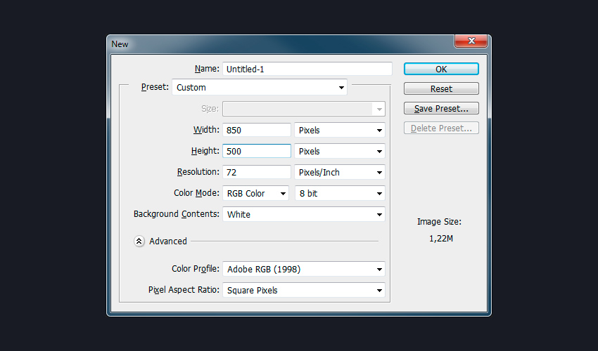 Начнем с создания документа размером 850 x 500 px со следующими параметрами: