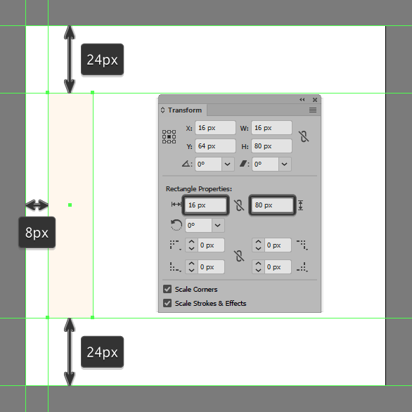 Начнем с создания первой книги. Для этого возьмите инструмент Rectangle/Прямоугольник, и создайте фигуру размером 16 x 80 px. Укажите ей цвет заливки #FFF7EE, и расположите как показано ниже, относительно рабочей области.