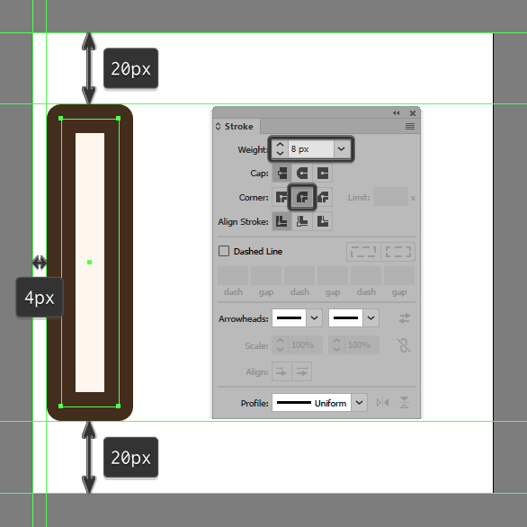 Укажите фигуре обводку цвета #3F2514, толщиной в 8 px и со скругленными углами. Все это можно сделать в палитре Stroke/Обводка.