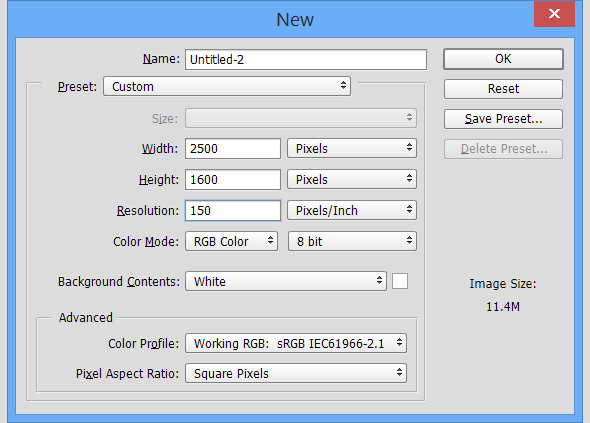 Откройте Photoshop и создайте новый документ размером 2500px на 1600px и разрешением в 150 pixels/inch. Укажите белый цвет фона.