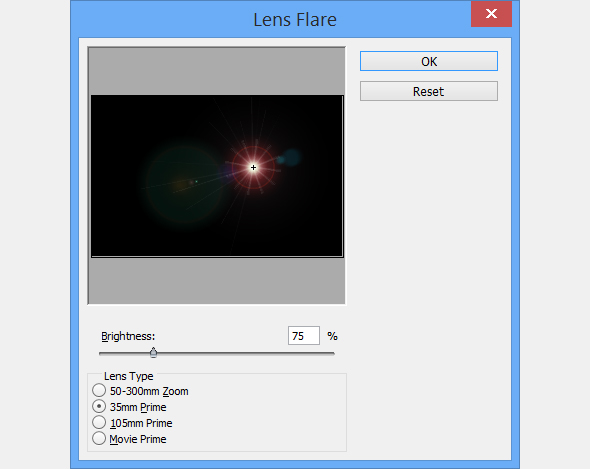 - В меню Filter/Фильтр выберите Render -> Lens Flare/Рендеринг>Блик