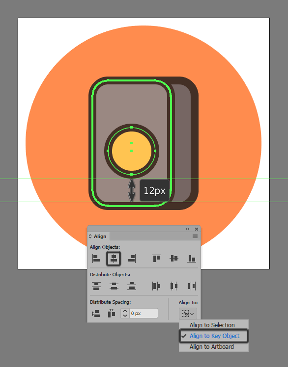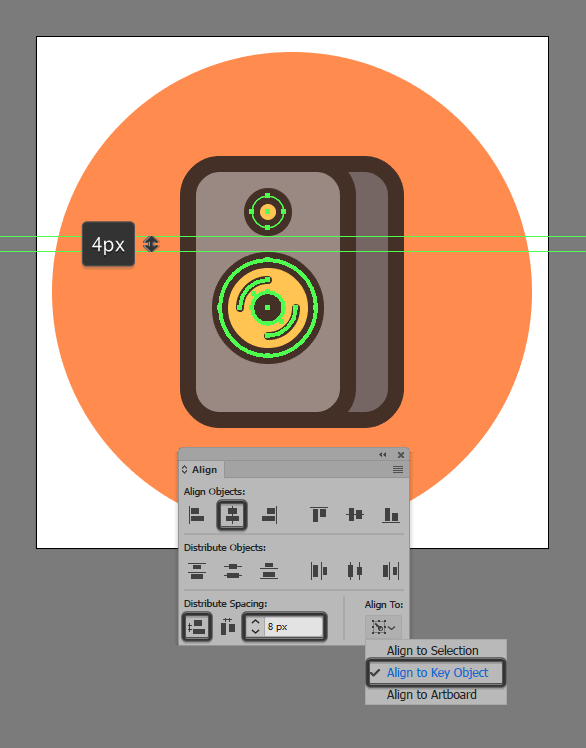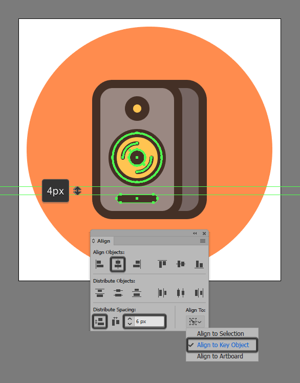 Нарисуем динамик, используя круг размером 24 x 24 px с цветом заливки #FFC550 и обводкой толщиной в 4 px и цвета #422C21. Выровняйте круг по вертикальному центру верхнего прямоугольника и разместите на 12 px выше его нижней стороны.