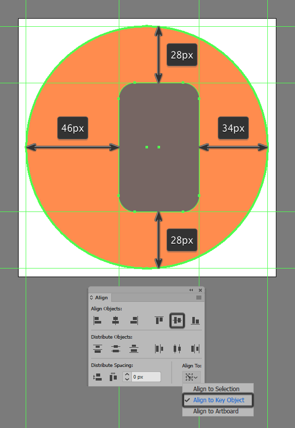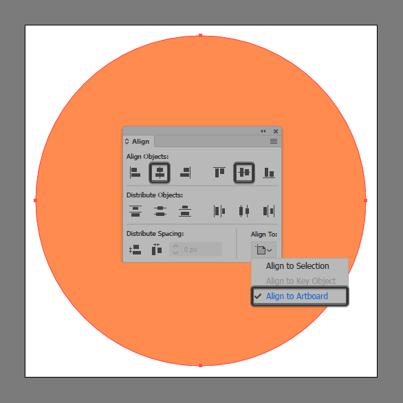 Инструментом Ellipse/Эллипс нарисуйте круг размером 120 x 120 px, укажите ему заливку цвета #FF8D4D, и выровняйте его по центру относительно холста, как показано ниже.