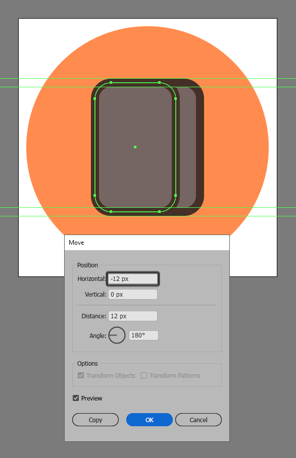 Выделите только что созданную группу, копируйте ее (Control-C) и вставьте копию на передний план (Control-F). Инструментом Move/Перемещение сдвиньте прямоугольник на 12 px вправо.