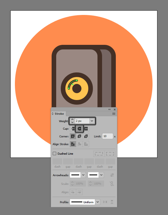 Инструментом Direct Selection/Прямое выделение (A) выделите правую и нижнюю точки и удалите их, нажав Delete. Укажите обводке скругленные концы.