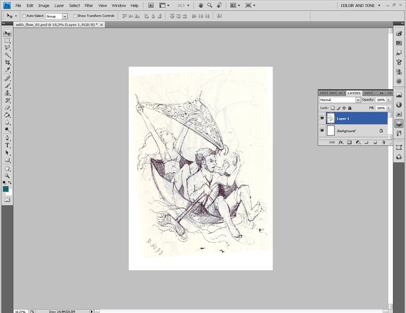 Сначала я рисую эскиз в скетчбуке, который потом сканирую и импортирую в photoshop. Создаю стандартный документ А4 и перетаскиваю изображение на первый слой.