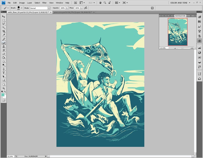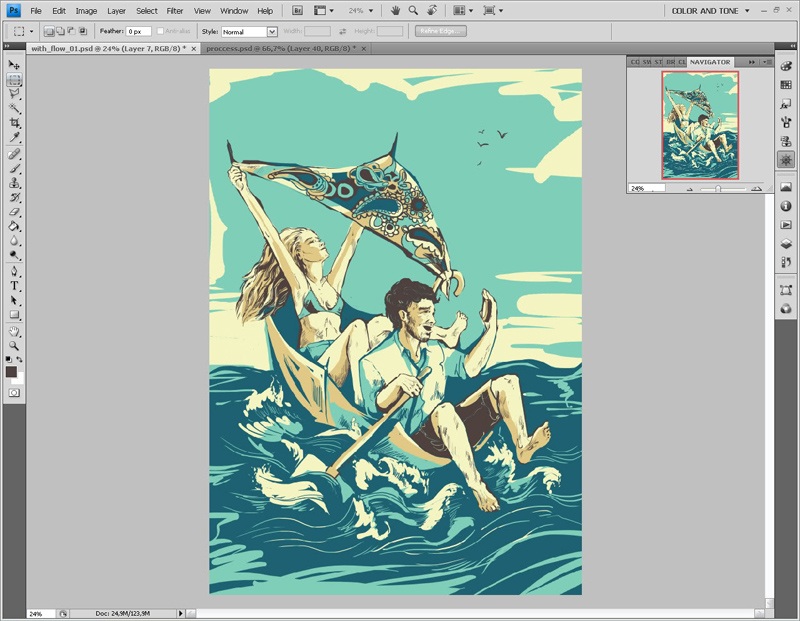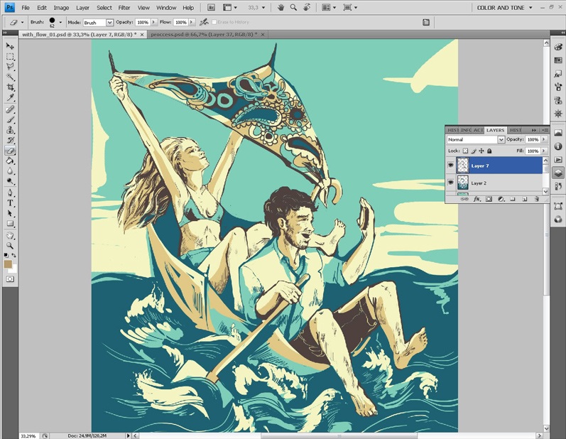 Так или иначе, что-то в иллюстрации меня по-прежнему не устраивает. И я решаю местами заменить цвет контуров-теней.