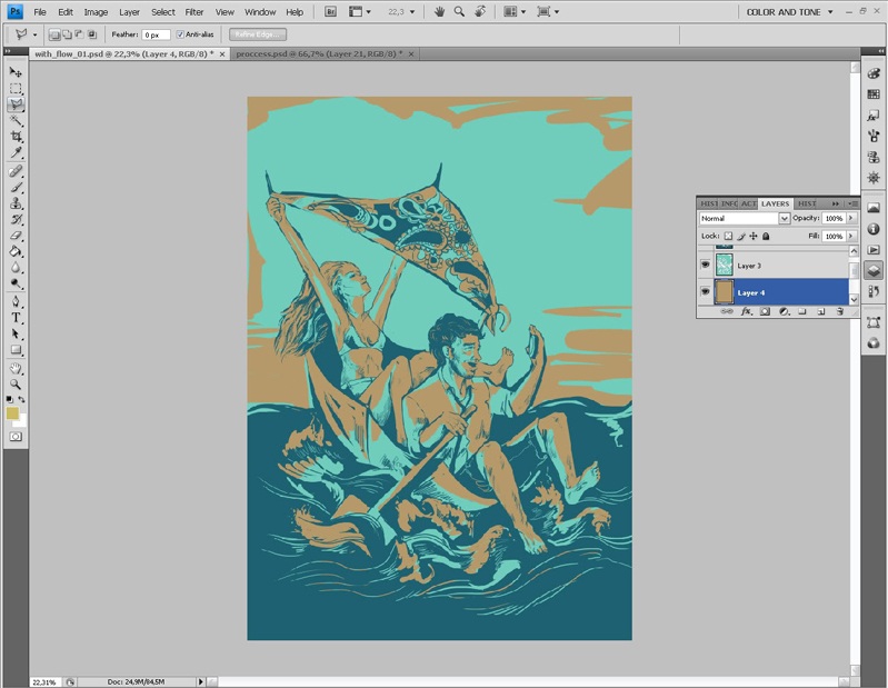 После создаю новый красочный слой и проделываю с ним те же операции по удалению лишних зон.