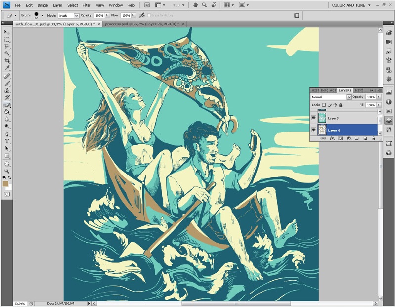 Посмотрев на изображение в целом, я решаю заменить голубые тени на телах персонажей на коричневые. Для этого я создаю ещё один коричневый слой.