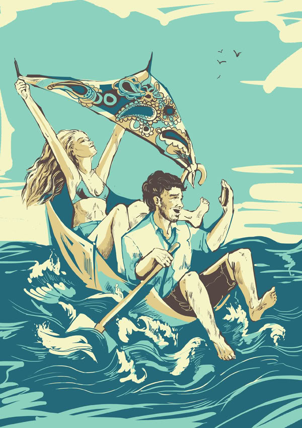 Вообще то они плывут на зонтике, и к его ручке привязана косынка — парус, края которой и держит девушка, отличная идея))) и исполнение, спасибо...