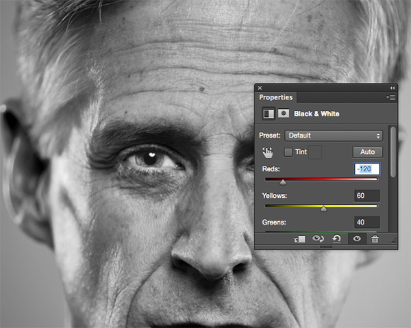 Добавьте корректирующий слой (Adjustment Layer) Black and White/Черный и белый и добавьте контраста изображению, затемнив красный канал.