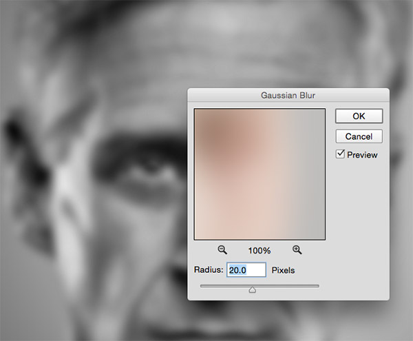 Выберите слой с фотографией и примените к нему фильтр Gaussian Blur/Размытие по Гауссу. Укажите радиус около 20px. Эта размытость позволит сгладить эффект смещения.