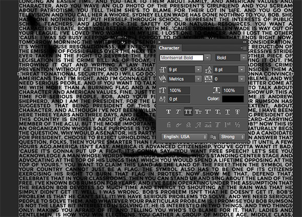 Если вашего текста не хватает на то, чтобы заполнить весь портрет, вы можете копировать его и вставить вновь. Выберите подходящий шрифт (в нашем случае это Montserrat Bold в режиме все заглавные). Настройте размер шрифта так, чтобы он плотно перекрывал портрет.