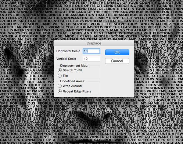 Сделайте активным слой с текстом и в меню выберите Filter > Distort > Displace/Фильтр>Искажение>Смещение. Позвольте программе растрировать шрифт, затем укажите значения 10 в Horizontal/Горизонтальном и Vertical scale/Вертикальном масштабировании. После этого нажмите OK и найдите файл displace.psd.