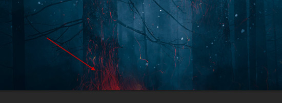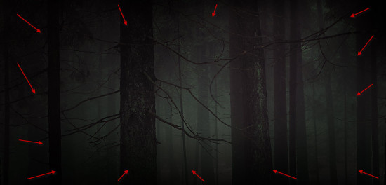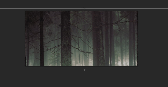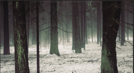 Создайте новый документ с размерами 1440 х 700 с черной заливкой. Начнем с создания фона, на котором будет снежный лес. Загрузите скачанную картинку леса в Фотошоп и выберите центр верхней части изображения.