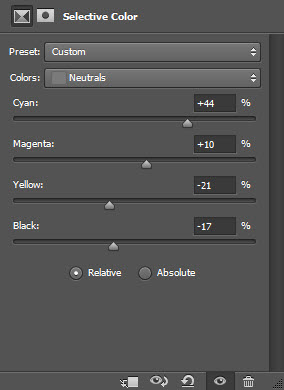 Примените к верхнему слою следующущие настройки в Selective Color / Выборочная Коррекция: