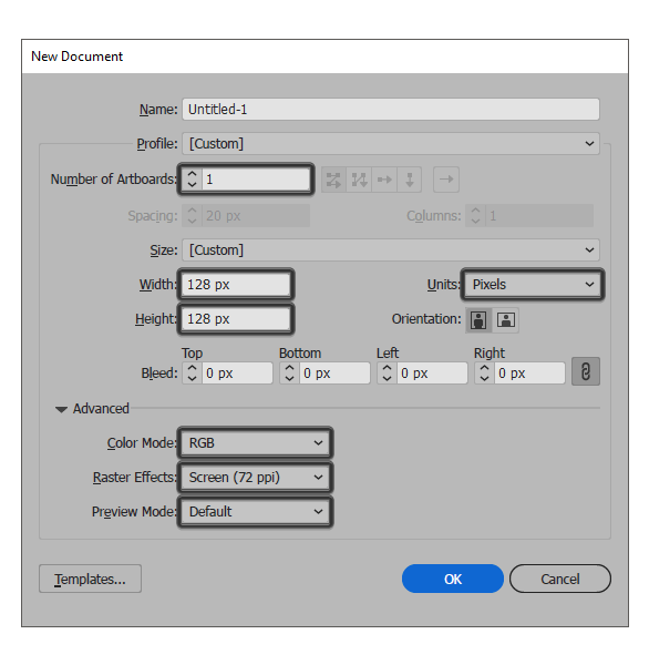 Для начала создайте новый документ, выбрав в меню File > New/Файл>Создать (или нажмите Control-N). Укажите параметры как показано на картинке ниже.