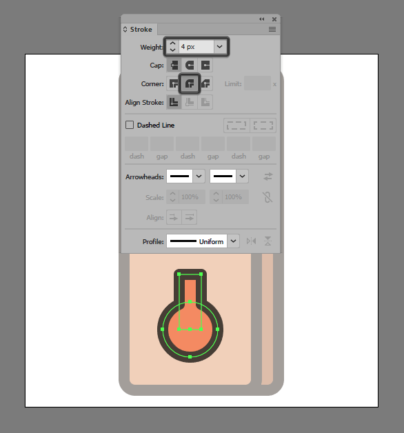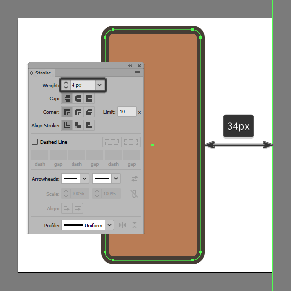 Укажите получившейся фигуре обводку как мы делали выше. Укажите ей тот же цвет (#443A32) и толщину (4 px). А также скругленные углы в палитре Stroke/Обводка.