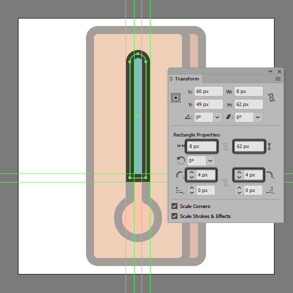 Добавим столбик термометра. Нарисуйте прямоугольник размером 8 x 62 px (#7FBFBC), и скруглите его верхние углы на 4 px в разделе Transform/Трансформация палитры Rectangle Properties/Свойства прямоугольника. Укажите получившейся фигуре обводку толщиной в 4 px (#443A32).