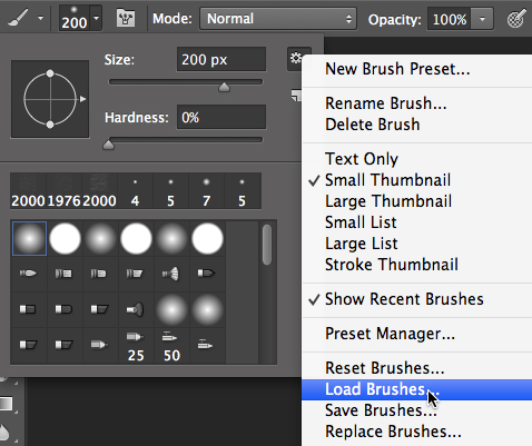 Наше изображение уже похоже на заснеженное, но мы можем сделать его еще лучше, добавив падающего снега. Для этого нам понадобятся кисти снега от Obsidian Dawn. Зайдите на страницу для скачивания, прочтите условия лицензии, скачайте кисти Snow & Snowflakes Brushes. Перетащите файл SS-snow.abr в легкодоступное место на вашем жестком диске и вернитесь в Photoshop. Возьмите инструмент Brush/Кисть, нажмите D, затем X (теперь ваш первый цвет должен быть белым). В панели настроек откройте Brush Preset/Набор кистей, откройте выпадающее меню в правом верхнем углу и выберите Load Brushes/Загрузить кисти.
