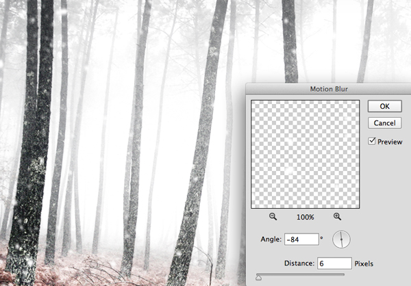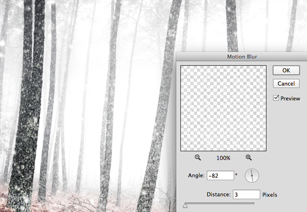 Нажмите Return (PC: Enter). Теперь давайте придадим снежинкам движения. Для этого выберите в меню Filter>Convert for Smart Filters/Фильтр>Преобразовать для смарт-фильтров, а затем Filter>Blur>Motion Blur/Фильтр>Размытие>Размытие в движении. Настройте Angle/Угол и Distance/Расстояние так, чтобы снежинки смотрелись реалистично.