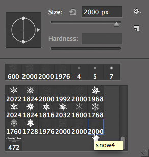 Выберите кисти SS-snow и откройте их, чтобы добавить к набору кистей. Вновь откройте набор кистей и проскрольтесь в самый низ. Выберите кисть 2000 pixel snow2.