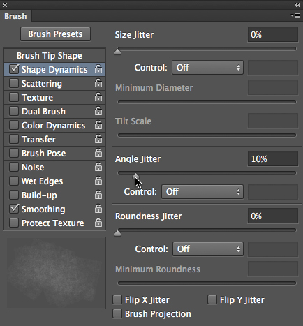 Откройте палитру Brush/Кисть и кликните по меню Shape Dynamics/Динамика формы. Укажите Angle Jitter/Колебание угла в 10%, чтобы снежинки выглядели немного по-разному.