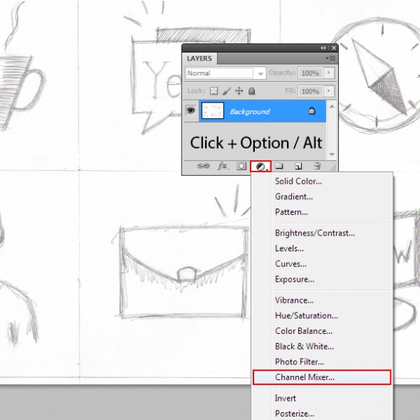 Нажмите на кнопку «New fill or adjustment layer» в панели слоев, удерживая Option / Alt . Выберите из выпадающего меню Channel Mixer.