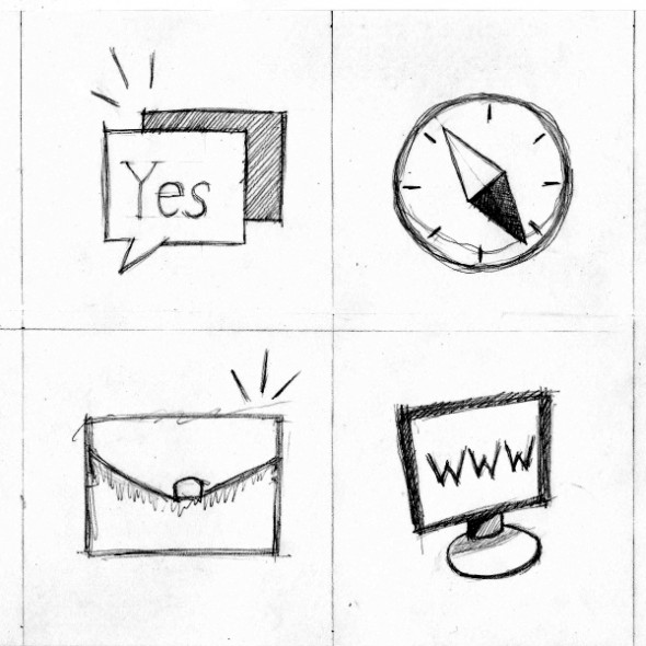 На обычной бумаге формата А4 рисуем несколько простых эскизов карандашом. Для того чтобы получить иконки более или менее одного размера, можно разделить лист на шесть равных квадратов. Размеры одного квадрата получились 100×100 мм.
