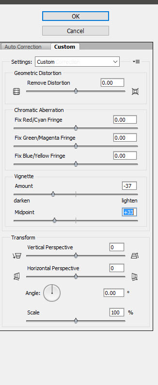 И в качестве финального штриха этот шаг. Создайте новый слой (Ctrl + Shift + Alt + N) и залейте его белым цветом (Shift + F5). В меню выберите Filter > Lens Correction/Фильтр>Коррекция дисторсии. Укажите параметры как на картинке ниже, чтобы создать виньетку. Укажите слою режим наложения Multiply/Умножение.