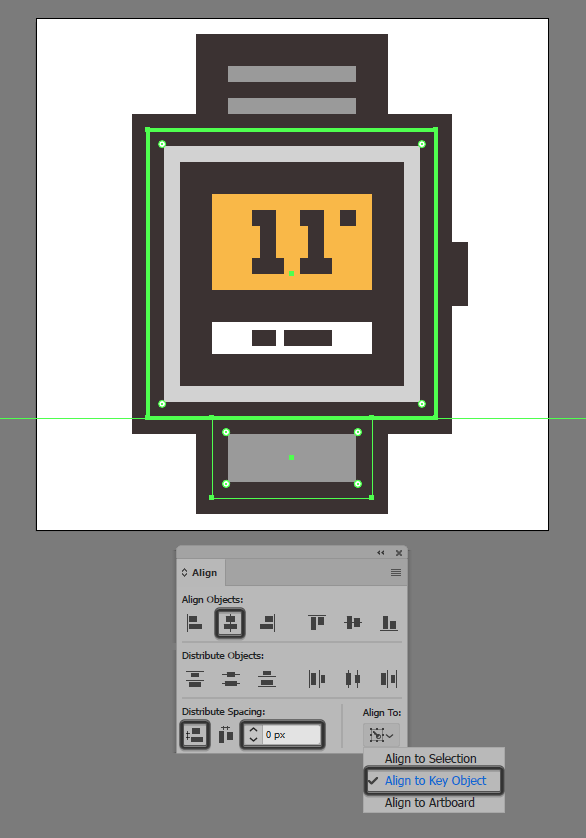 Нарисуйте еще один небольшой прямоугольник размером 4 x 16 px того же цвета в правой части часов. Это будет наша кнопка. Выровняйте его относительно группы, затем сгруппируйте вместе всю работу (Control-G).