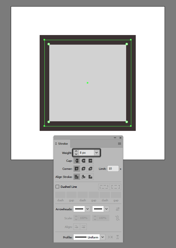 Дублируйте только что созданный квадрат, нажав Control-C и Control-F. Верхней копии укажите отсутствие заливки и обводку цвета #382E2E, толщиной в 8 px.