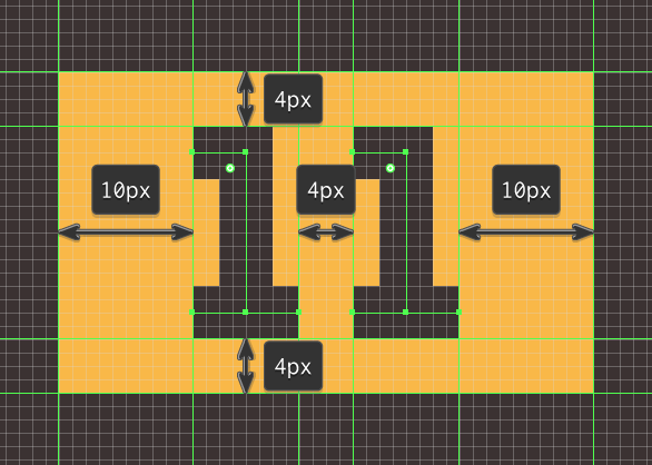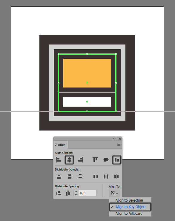Нарисуйте еще один прямоугольник ниже. Укажите ему размер 48 x 16 px и белый цвет заливки, а также нашу обводку. Поместите его в нижнюю часть желтого квадрата и выровняйте его как показано ниже.