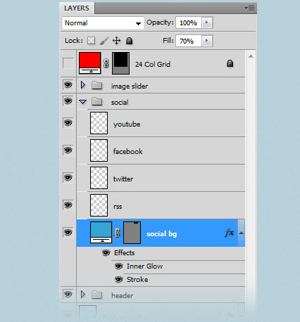Загрузите иконки социальных сетей и откройте их в Photoshop. Переместите их с помощью Move Tool (V) и сгруппируйте все эти слои (удерживая клавишу Ctrl, выберите их и нажмите Ctrl + G). Назовите группу „социальные иконки“.