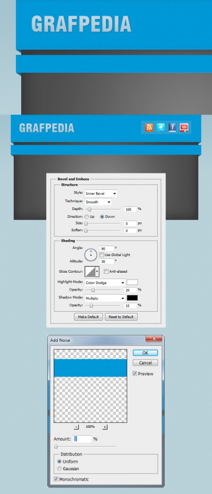 Назовите этот слой „BG навигации“, щелкните правой кнопкой мыши по нему и выберите Convert to Smart Object (Преобразовать в смарт-объект). Дважды щелкните на этом слое и используйте настройки из следующих изображений. Затем перейдите на Filter> Noise> Add Noise и установите параметры, как на картинке ниже.