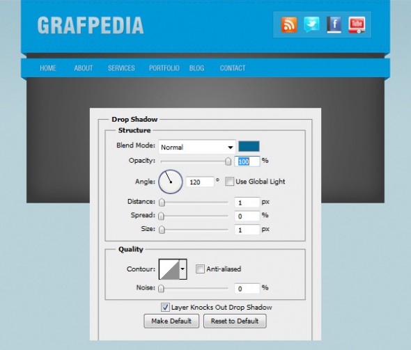 Создайте новую группу и назовите ее „пункты меню“. Выберите Type Tool (T) и напишите название элементов меню навигации. В уроке был использован шрифт Swiss Roman Condensed, его цвет — # e2e9ec. На текстовые слои добавьте тени, используя настройки из следующих изображений. Цвет, который был использован для Drop Shadow — # 066993.