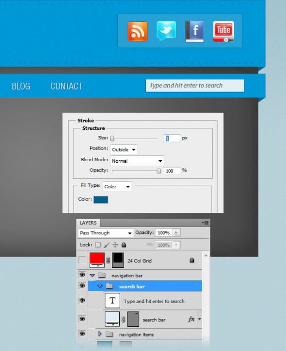 Создайте новую группу и назовите ее „Панель поиска“. Выберите Rectangle Tool (U) и создайте прямоугольник размером 210px на 26px и цветом # e2f0f4. Поместите этот прямоугольник в правой части панели навигации. Назовите этот слой „Панель поиска“ и добавьте к нему обводку — 1px, используйте цвет # 006089.