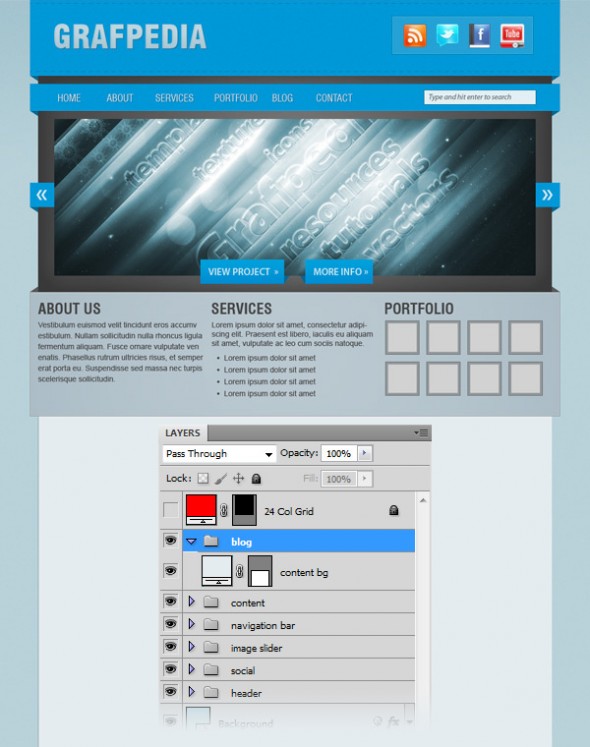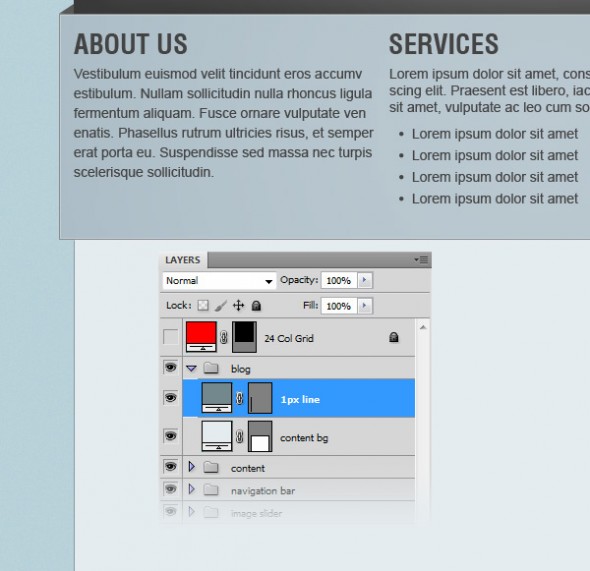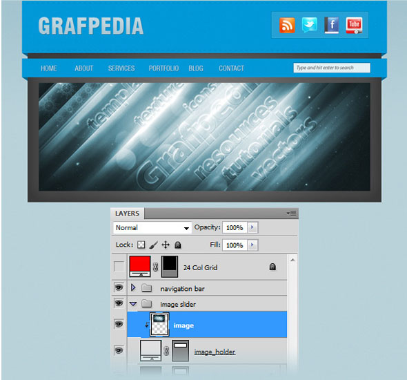 Переходим к группе «слайдер изображений». Выберите Rectangle Tool (U) и создайте прямоугольник размером 890px на 290px. Цвет не имеет значения. Назовите этот слой „image_holder“. Затем откройте изображение, которое вам нравится и с помощью Move Tool (V) переместите его в свой первоначальный документ. Разместите изображения над слоем „image_holder“ и щелкните правой кнопкой мыши на слое изображения и выберите Create Clipping Mask. Это позволит сделать изображение видным только в области прямоугольника »image_holder". Назовите этот слой «image».