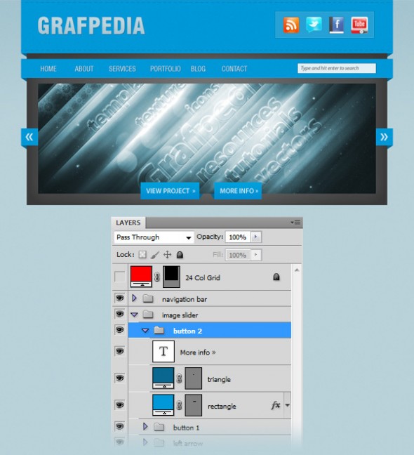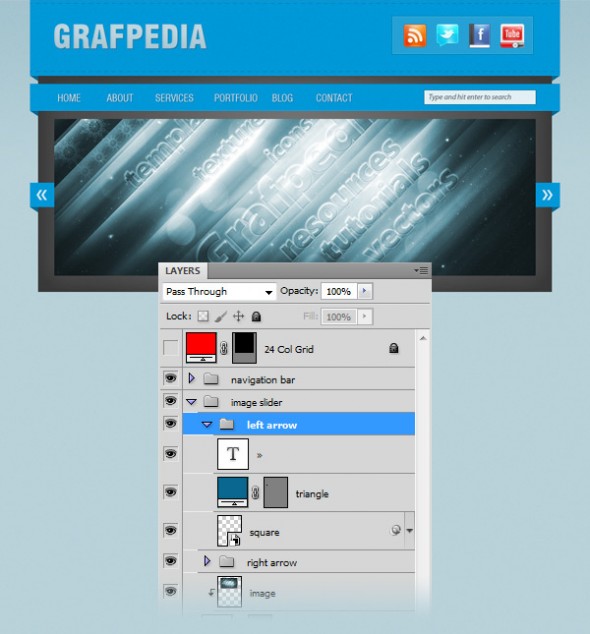 Дублируйте группу "стрелка вправо". Затем перейдите к Edit> Transform> Flip Horizontal. Назовите новую группу «стрелка влево» и с помощью Move Tool (V) переместите его в левую часть слайдера изображений.