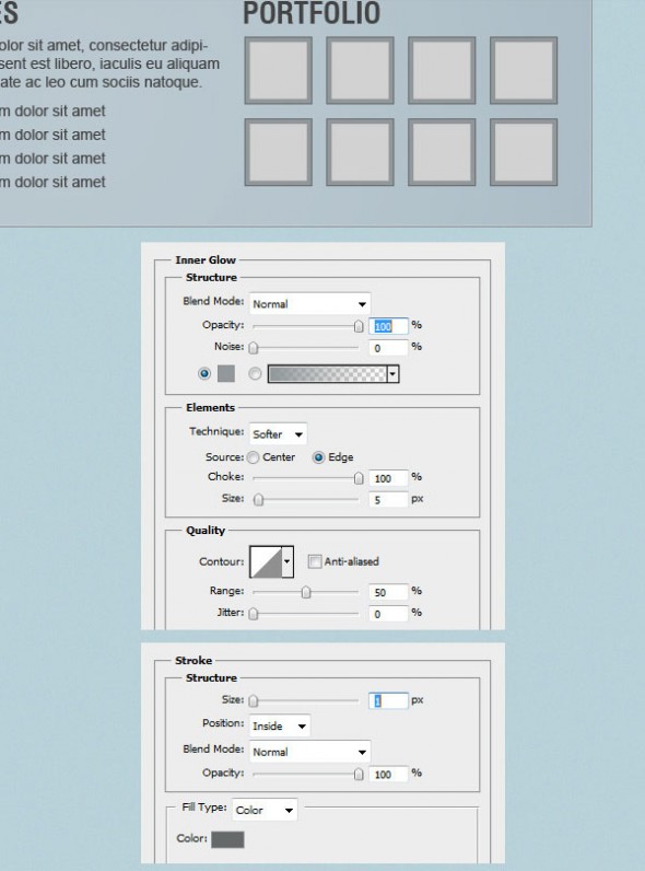 Выберите Rectangle Tool (U) и создайте прямоугольник размером 980px на 230px и цветом # b2c2cb. Назовите этот слой «BG содержания», дважды щелкните по нему, чтобы открыть окно Layer Style и используйте настройки следующих изображений. Цвет, который был использован для stroke # 8a8c8d.