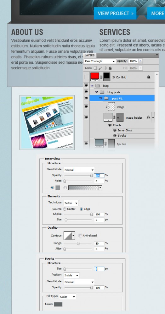 Создайте новую группу и назовите ее «блог». Выберите Rectangle Tool (U), нажмите и удерживайте клавишу Shift и создайте квадрат размерами 200px на 200px. Назовите этот слой «image_holder», дважды щелкните по нему и используйте настройки следующих изображений.