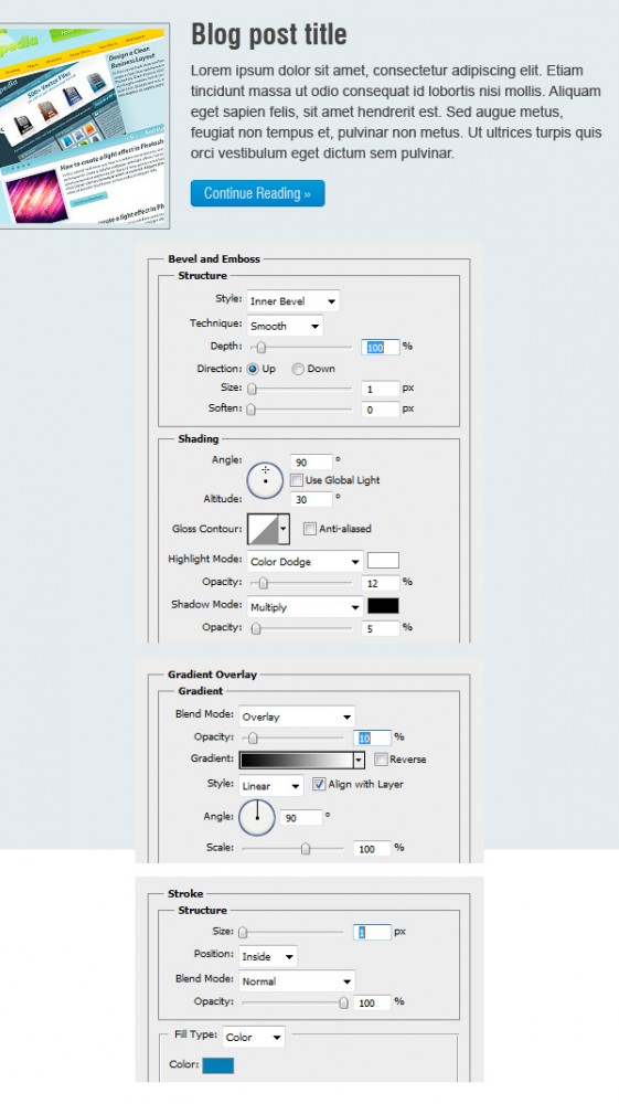 Теперь мы будем создавать кнопку для блога «читать далее». Выберите Rounded Rectangle Tool (U), установите радиус 4px и создайте прямоугольник с размерами 130px на 26px. Дважды щелкните на этом слое и используйте следующие настройки.
