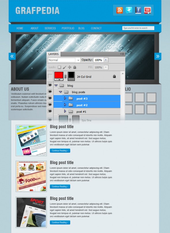 Затем откройте файл «960_grid_24_col.psd» (Папка “templates” > “photoshop”). После открытия PSD-файла в Photoshop вы увидите 24 красных колонrb. Это система сетки, которую мы будем использовать. Вы можете скрыть красные полосы, нажав на иконку глаза на слое «24 Col Grid».