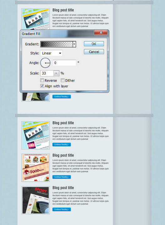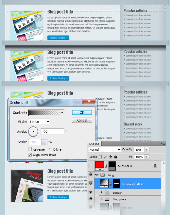 С помощью Rectangular Marquee Tool (M) создаем выделение в верхней части блога. Затем перейдите на Layer> New Fill Layer> Gradient и используйте настройки, как на изображениях ниже. Измените непрозрачность слоя с градиентом до 10%.