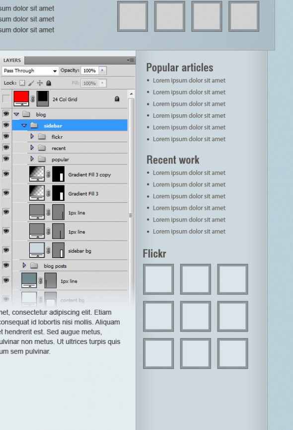 Создайте новую группу и назовите ее «сайдбар». Затем выберите Rectangle Tool (U) и создайте прямоугольник шириной 270px и цветом # cdd9df. Назовите слой «сайдбар BG». Поместите этот прямоугольник в правой части области блога.